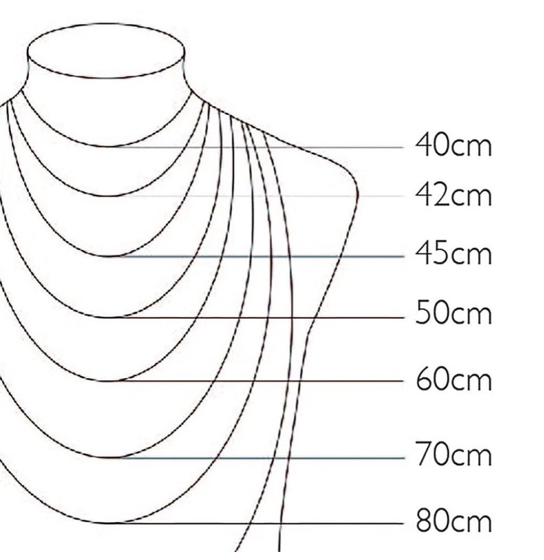 Molimo da pažljivo odaberete željenu duljinu ogrlice prilikom narudžbe. Prikaz na crtežu je simboličan i može varirati od osobe do osobe, ovisno o konstituciji tijela. Naknadna korekcija duljine naplaćuje se 15 €, a trošak dostave snosi kupac. Ako nije naveden font, gravura se izrađuje u krasopisnom stilu.